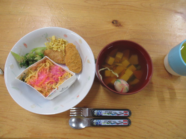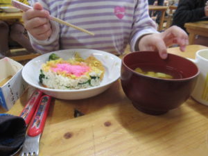 給食は、牛乳パックを切り取った枠で、ひし形の(菱餅に見立てた)ごはんを作りました。