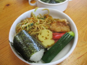 給食の夏祭りメニューは焼きそば、たこさんウインナー、から揚げ、かわいいポテト、パリパリの海苔を巻いたおにぎり、そしてスープ。