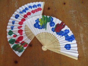 各クラスで、扇子にスタンプや絵を描いて、製作をしています。