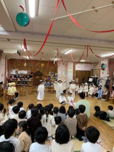 子どもたちは、クリスマスの歌や踊り、楽器を使ってお祝いをしています。